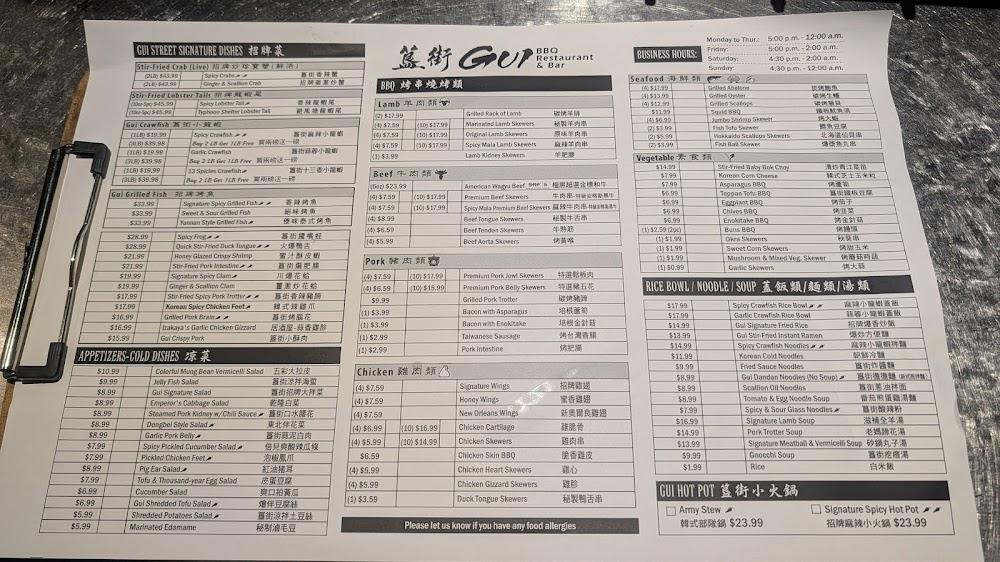 Gui offers an extensive menu showcasing a variety of BBQ skewers, with unique flavors that entice every palate.